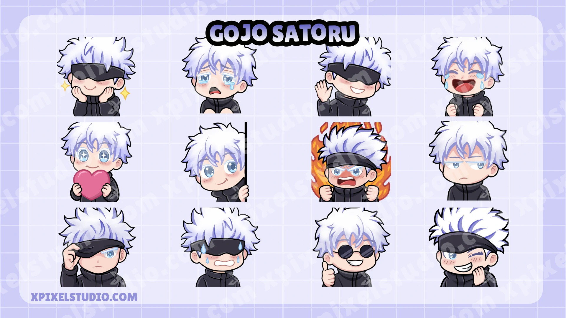This pack features 12 exclusive, high-quality emotes visualizing Gojo’s diverse expressions: